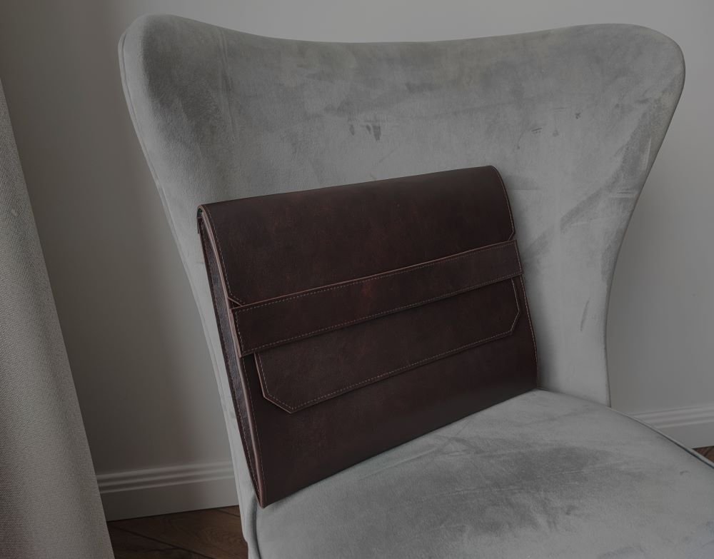 Natūralios odos A4 formato lapų dėklas. Dėklas pridaikytas didesniam dokumentų kiekiui (iki ~300 psl). Atvartas perkišamas per juostą.