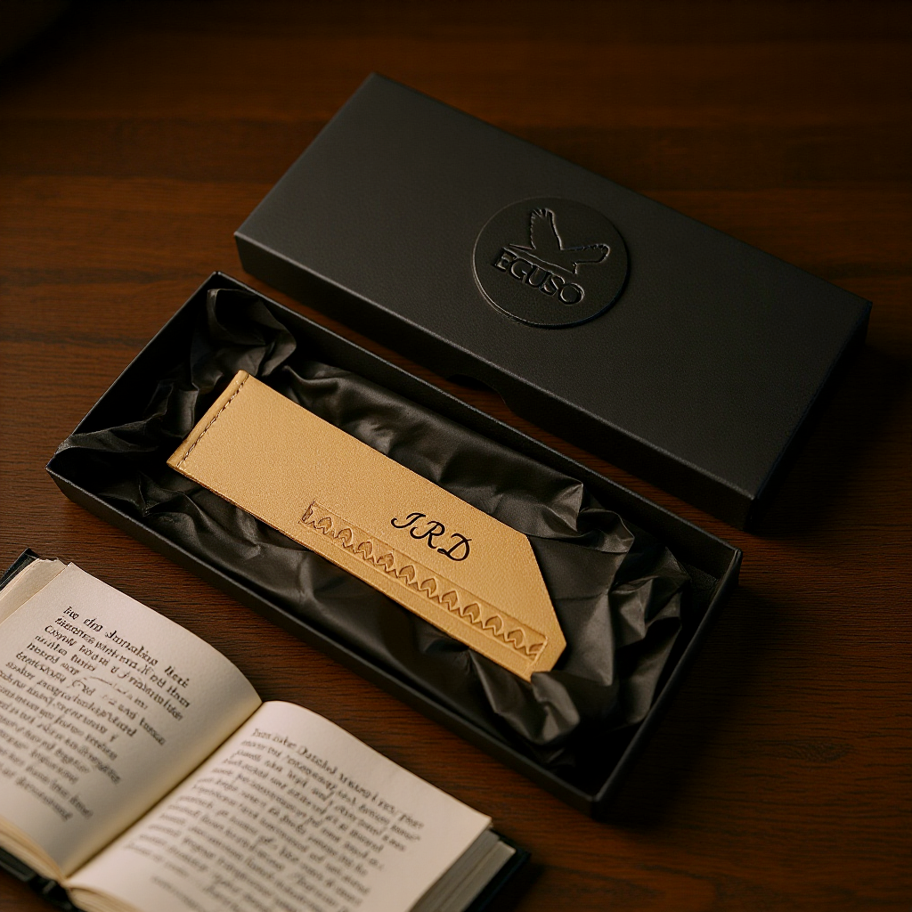 Natūralios odos knygų skirtukas su rašto įspaudu. Skirtukas užmaunamas ant puslapio.
