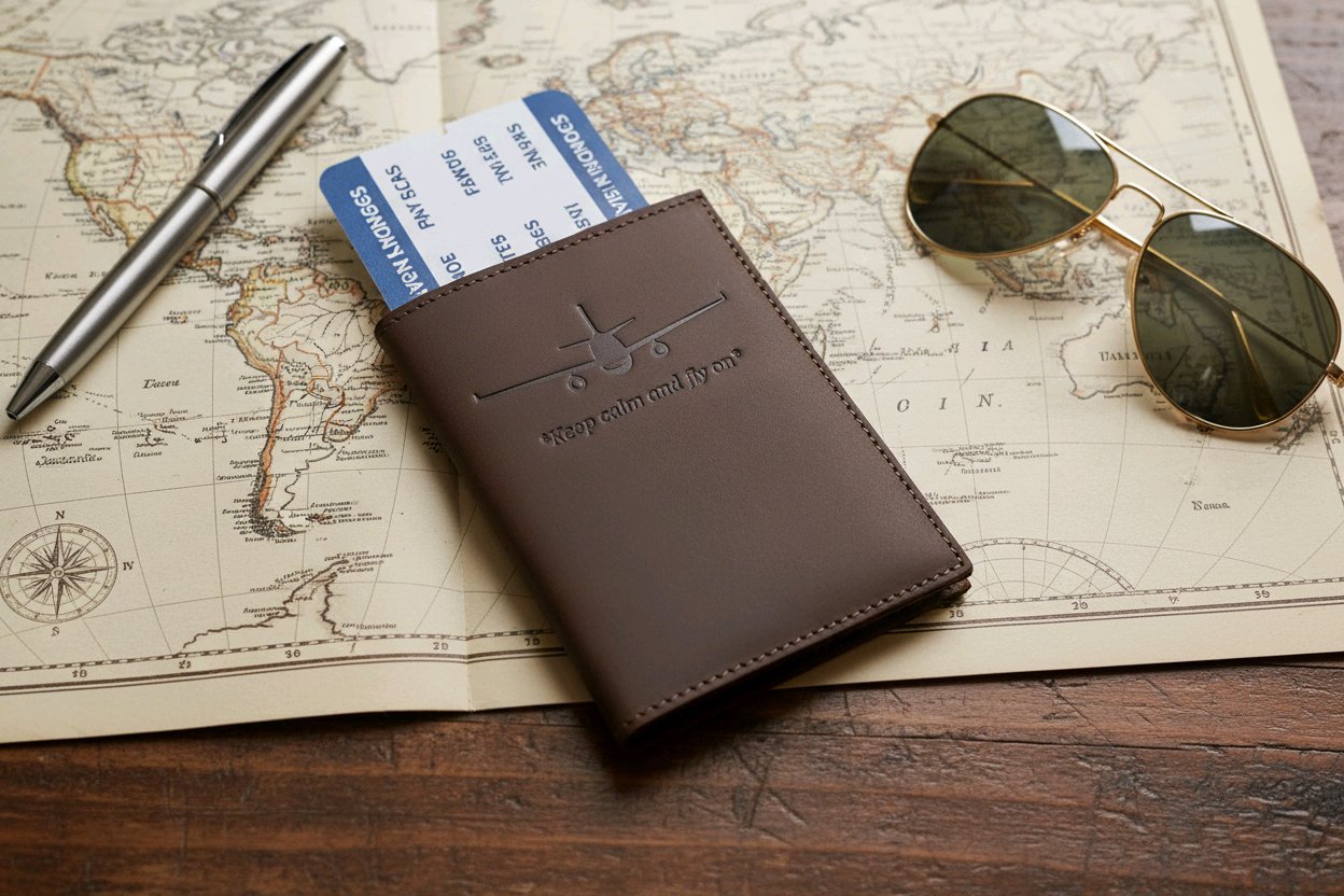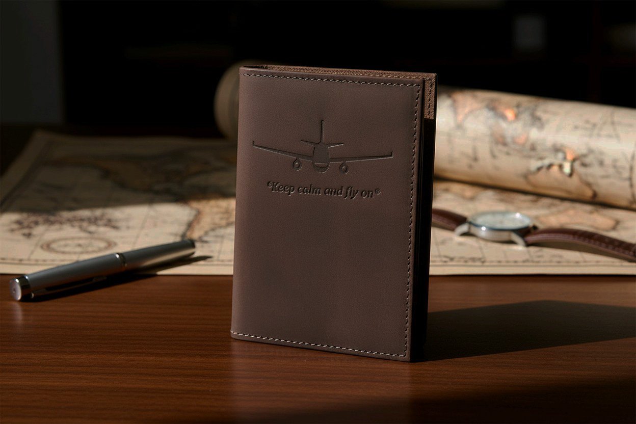 Natūralios odos paso dekliukas su lėktuvėlio ir užrašo „Keep calm and fly on“ įspaudu. Pagamintas Lietuvoje.  Puikus aksesuaras ar gera dovana artimajam.