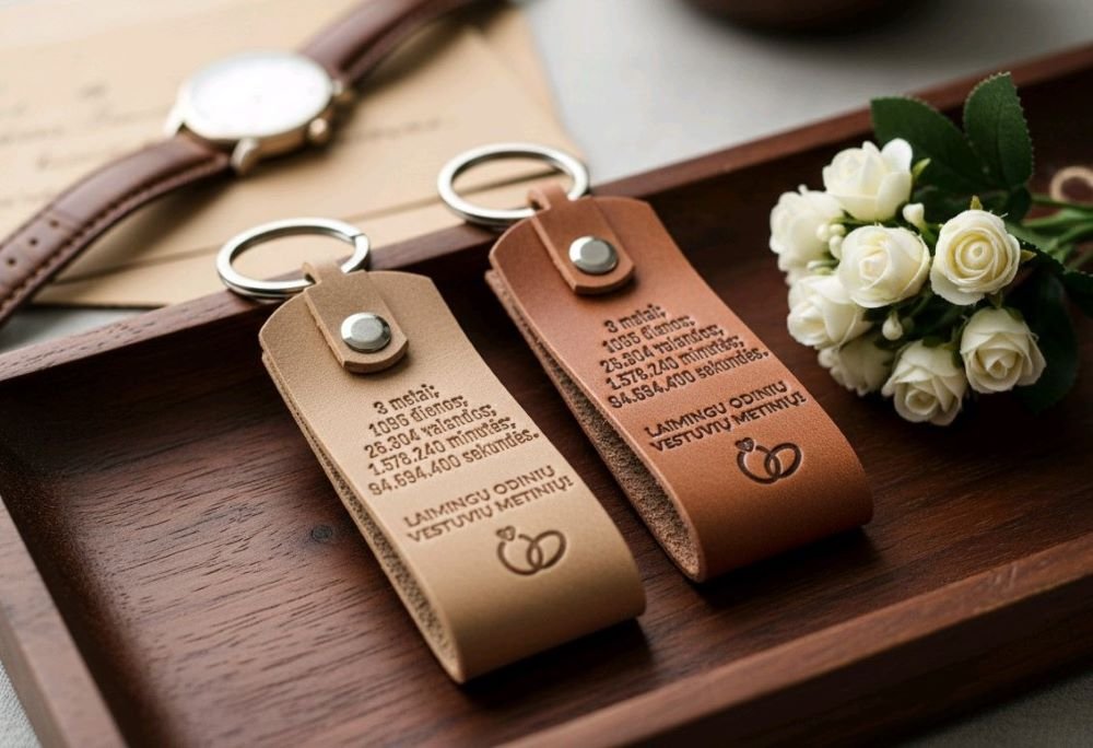 Natūralios odos raktų pakabukas sų įspaudu – odinių vestuvių dovana. Pakabukas puikiai tinka dovanoti ir odinėms vestuvėms paminėti.