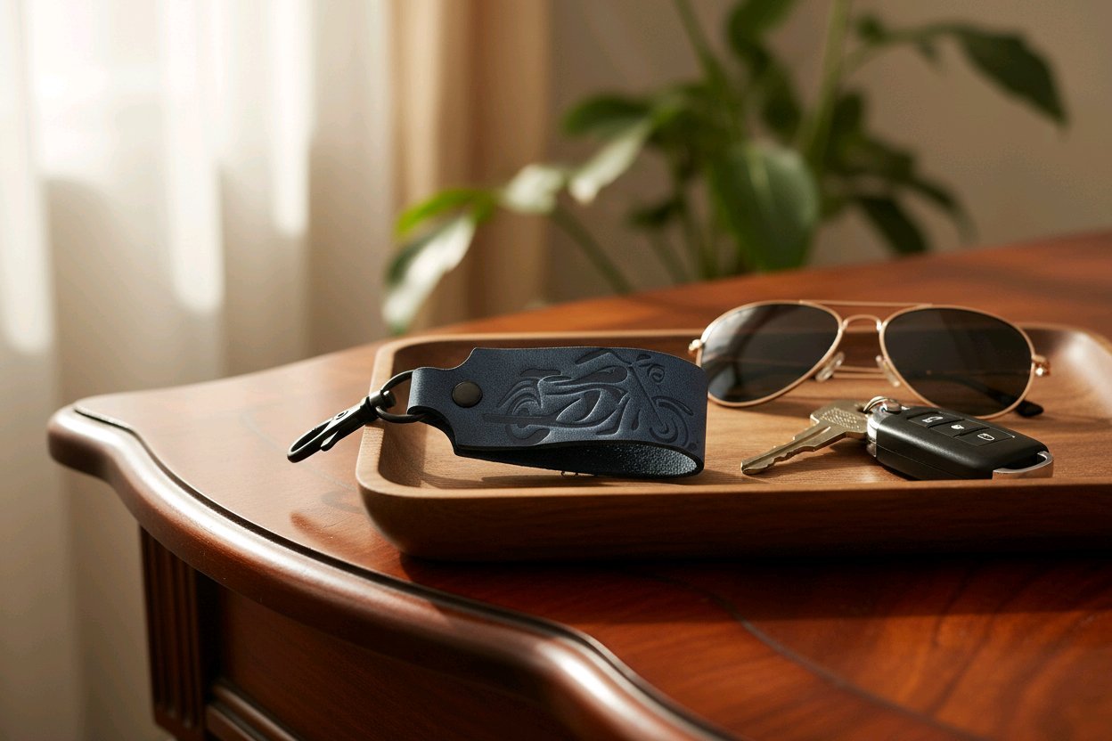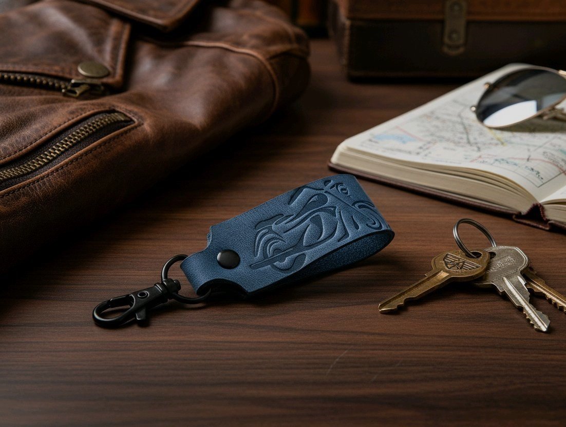 Tvirtos natūralios odos raktų pakabukas su motociklo įspaudu. Tai puiki dovana, suvenyras ir aksesuaras.   Raktų pakabukas kartu su metaliniu karabinu užkabinimui.