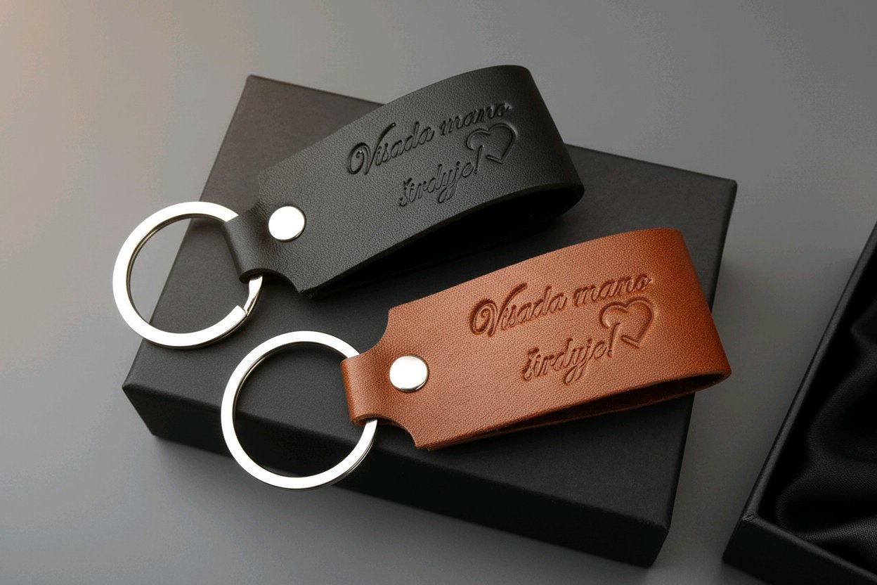 Tvirtos natūralios odos raktų pakabukas su įspaudu „Visada mano širdyje“. Tai puiki dovana, suvenyras ir aksesuaras Valentino dienos proga. Raktų pakabukas kartu su metaliniu 30mm skermens žiedeliu raktų užkabinimui.