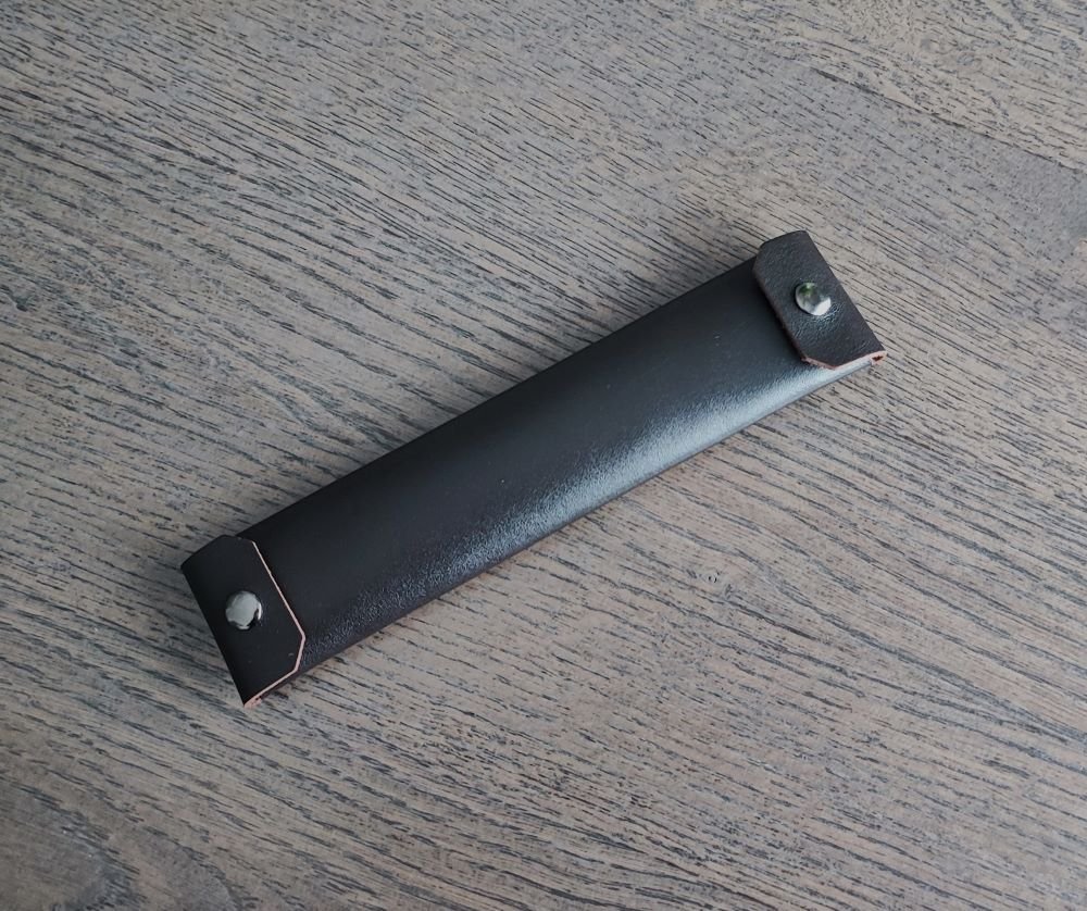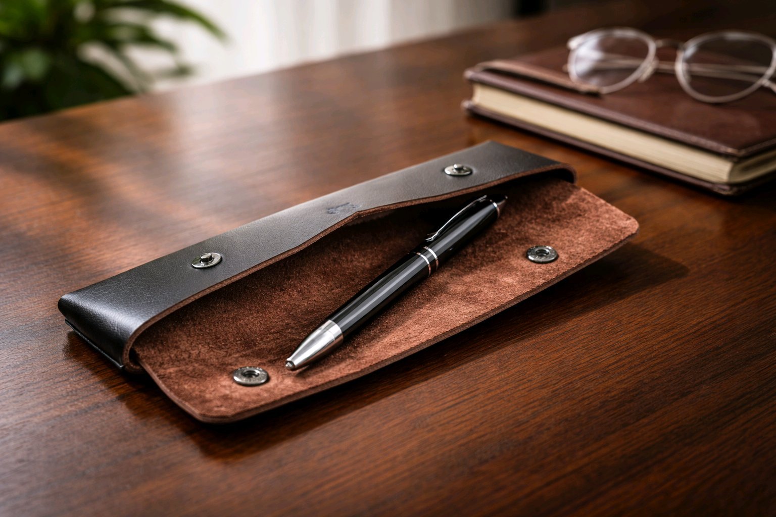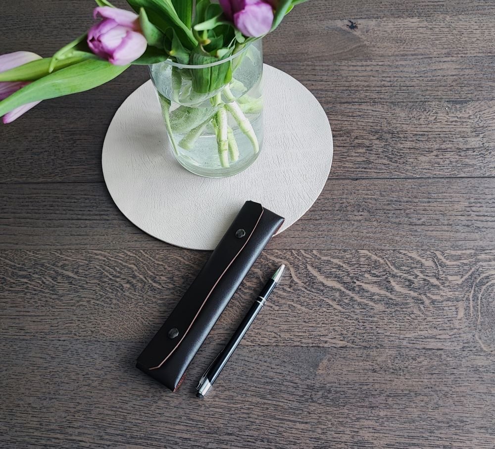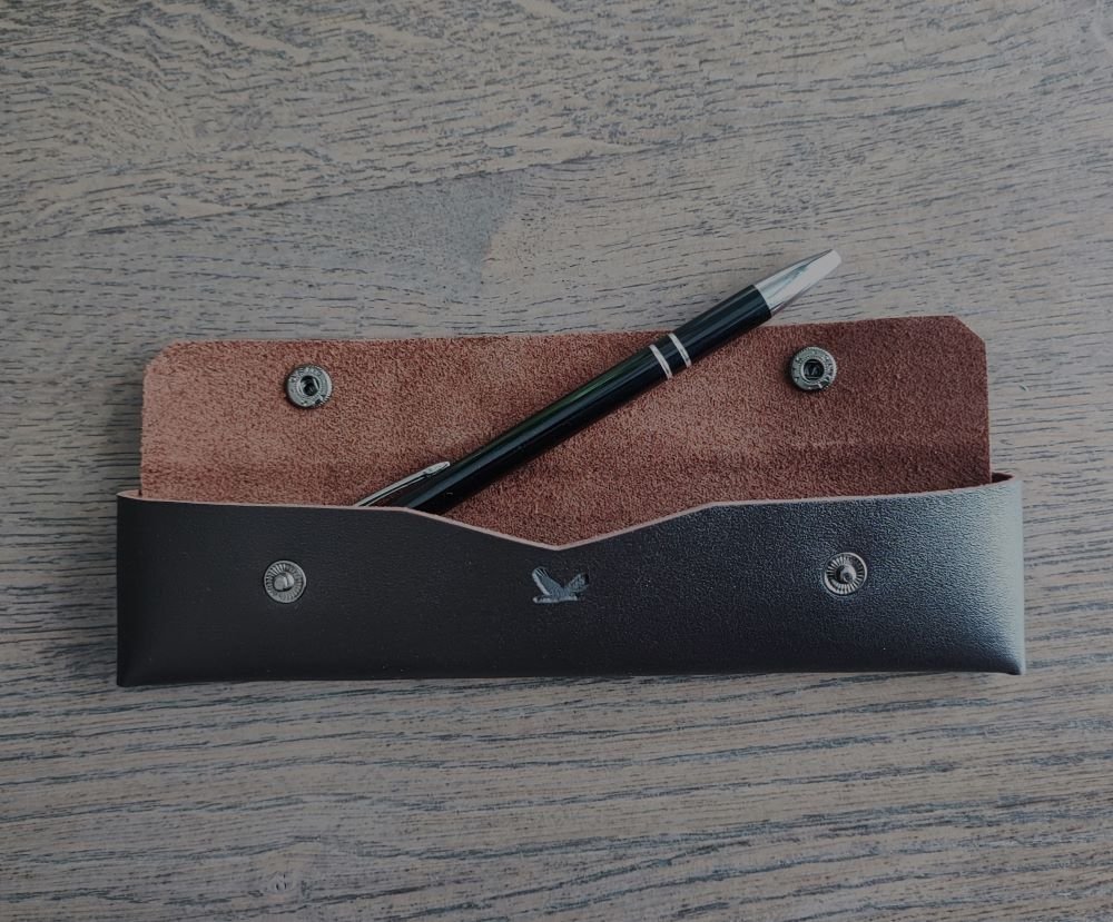 Odinis rašiklių dėklas. Užsegamas spaudėmis. Dėklas gali būti graviruojamas ir pritaikytas dovanai.